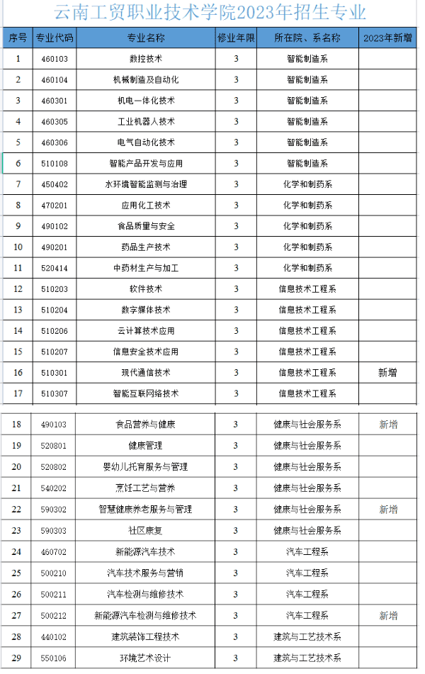 云南工贸职业技术学院现开设有智能制造、化工、生物制药、信息技术、社会服务、汽车、建筑等专业大类共29个专业,现有在校生6900余人。